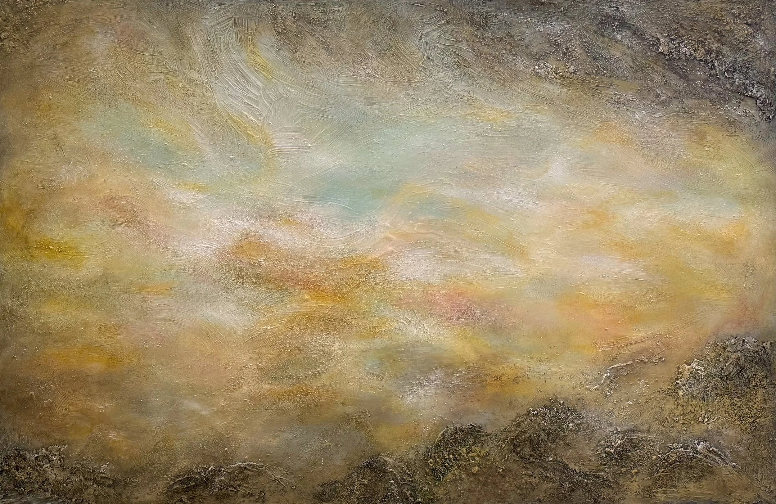 Media and Technique Modeling paste, mineral powders, acrylic paints, mediums, and pigments on a wooden panel. Built through sedimentary layering, embedded texture work, and surface modulation with ultra-matte finish. The field absorbs light rather than reflects it, allowing space and depth to emerge through quiet variation.