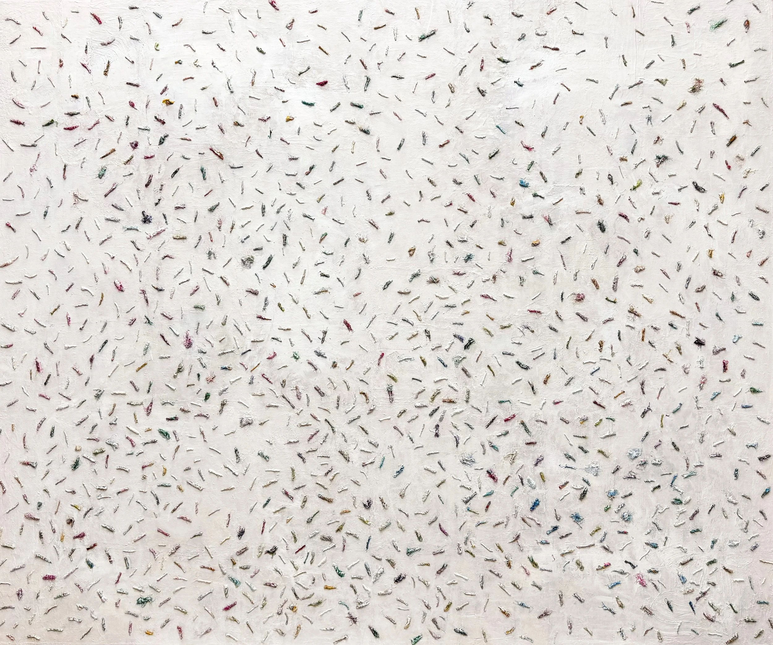 Layered acrylic washes, embedded textile fragments, and selective accenting create a diffuse, non-reflective field.