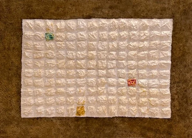 Media and Technique Calico and linen fabric, gesso, acrylic paint and mediums, subtle gold pigment, hand-finished wooden edging. Calico and linen were layered with gesso and shaped while wet to create soft folds and an uneven, light-absorbing surface. Motifs were finished separately with restrained gold washes and matte mediums, then assembled onto the panel. The edges were framed with hand-finished wooden strips, oiled for warmth while keeping a muted finish.