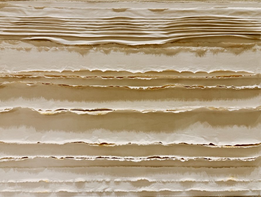 The formed layers were then fixed with acrylic medium, allowing the fabric to retain its softened, suspended contours as it dried.