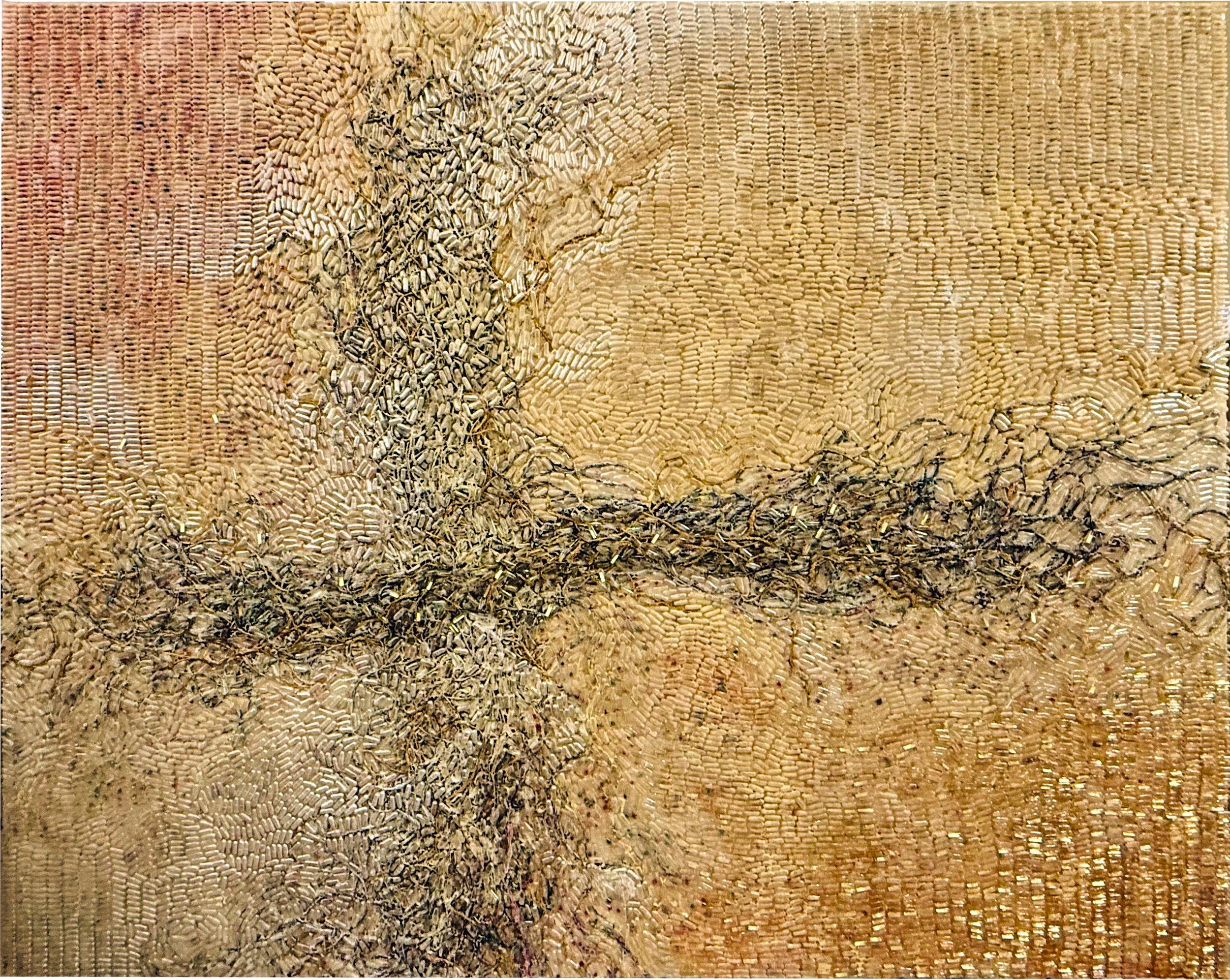 Thousands of empty gelatin capsules were filled, sealed, and hand-adhered onto a calico-mounted wood panel. Color layers were subtly adjusted through dry pigment and acrylic paint prior to embedding. The capsules were placed in directional flow—gently coiling and dispersing—evoking an organic root-like network. Variations in gloss, texture, and translucency were created using different medium concentrations and brushing techniques to allow sunlight to react differently across the surface throughout the day.